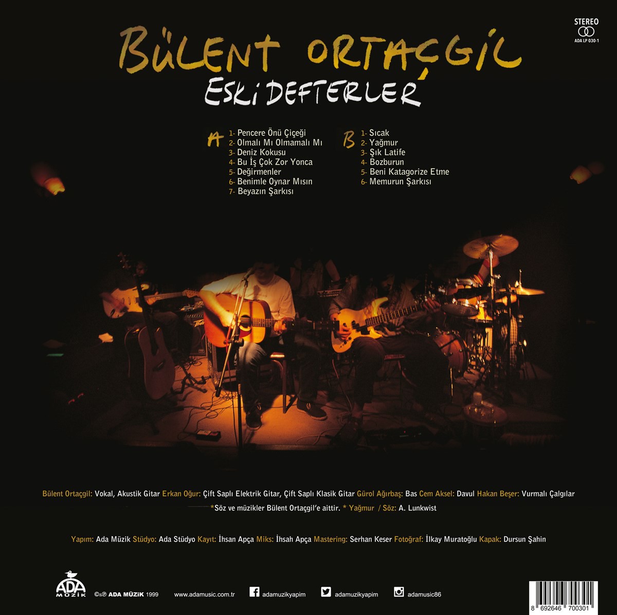 Bülent Ortaçgil'in en sevilen şarkılarının hücum kayıt olarak yeniden çalınarak hazırlanan ve iyi bir derleme albüm olan Eski Defterler şimdi de plak formatında.