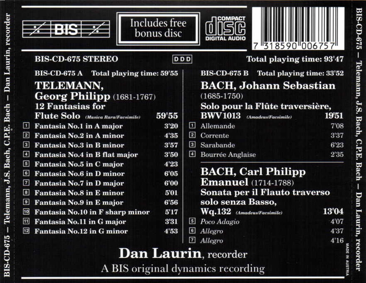 Dan Laurin: Telemann; J.S. Bach; C.P.E. Bach for recorder solo - CD Foto