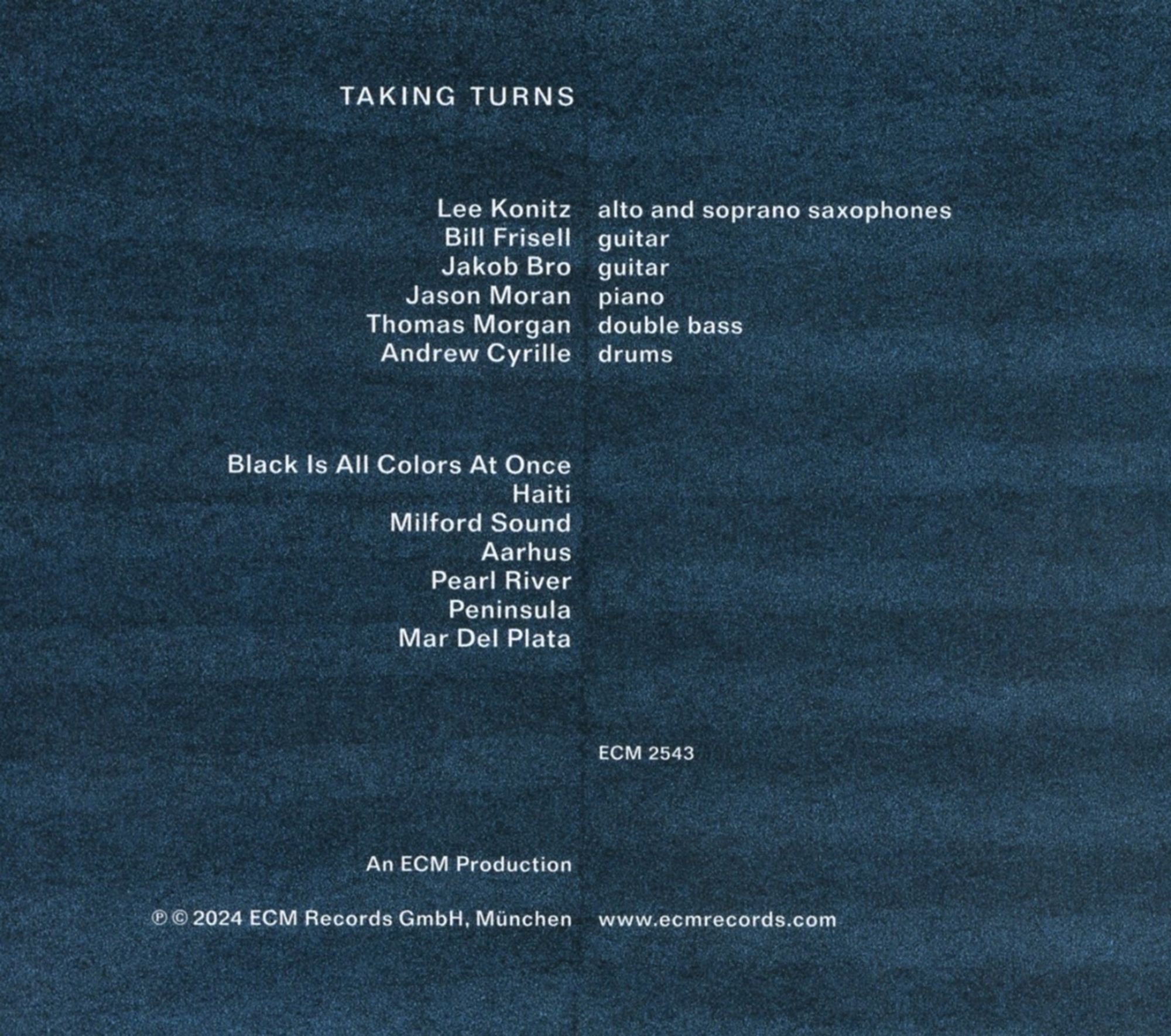 Taking Turns, recorded in New York's Avatar Studio a decade ago, finds Danish guitarist Jakob Bro joined by a multi-generational cast of improvisers, highly distinctive players all. Lee Konitz, Andrew Cyrille, Bill Frisell, Jason Moran and Thomas Morgan lend their energies to a session that bypasses conventions of the 'all-star' band and puts the emphasis on teamwork.