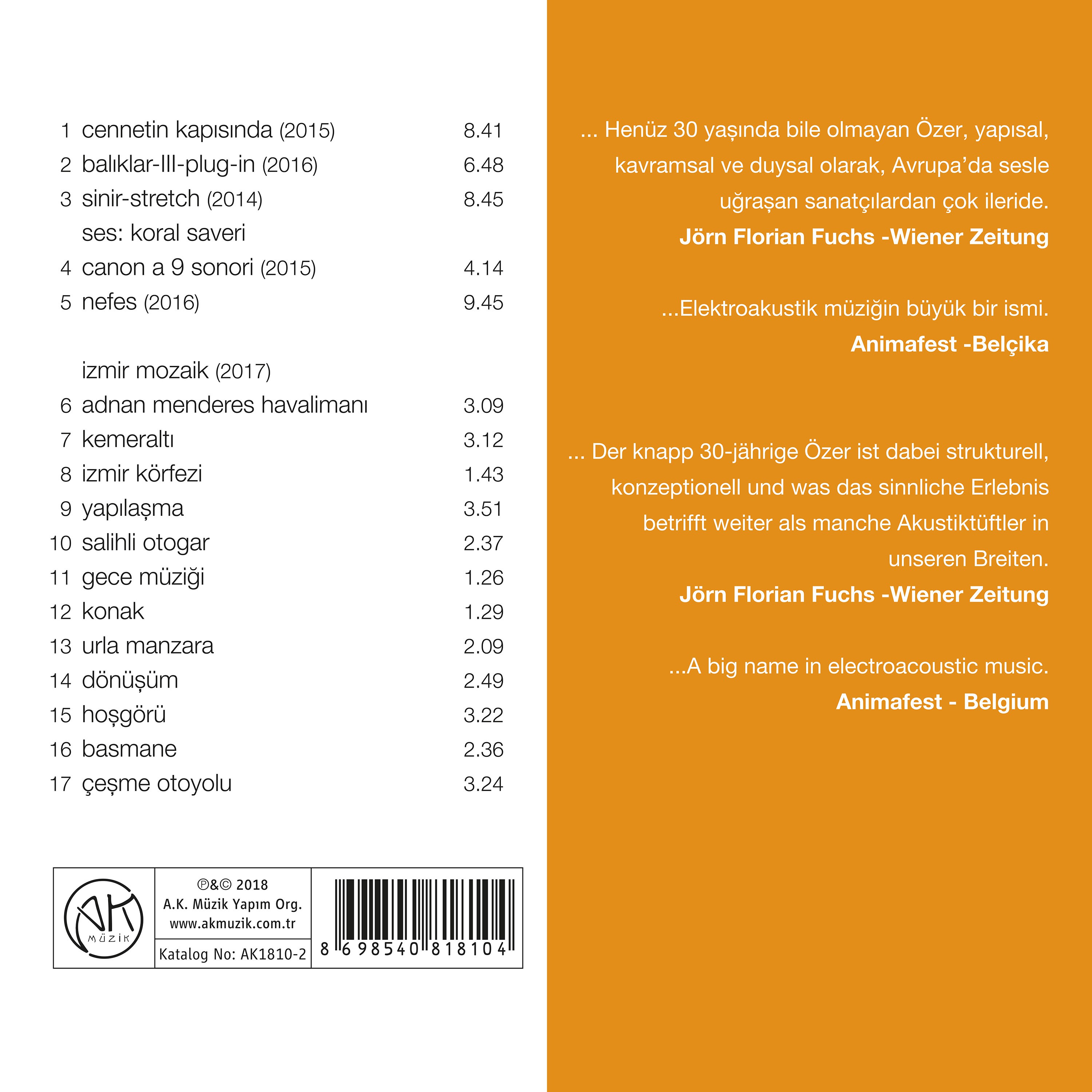 Barkod: 8698540818104 Firma: A.K. Müzik Yayın Tarihi: 15.10.2018 Tür: Klasik Müzik Tür: Elektroakustik Tür: 20-21. Yüzyıl Tür: Yerli Besteciler (Klasik Müzik) Tür: Yerli Yorumcular (Klasik Müzik) Format: 1 CD