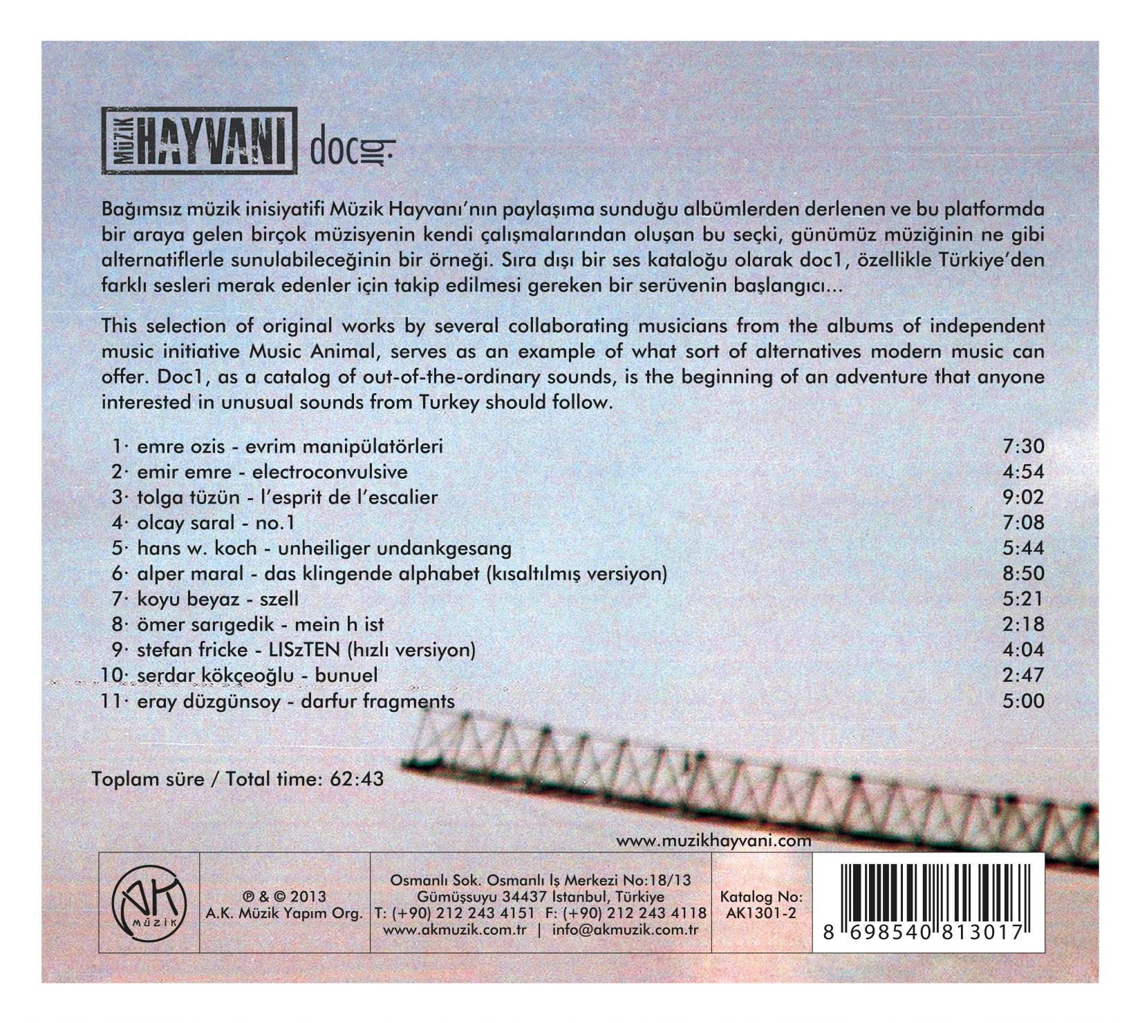 This selection of original works by several collaborating musicians from the albums of independent music initiative Music Animal, serves as an example of what sort of alternatives modern music can offer. Doc1, as a catalog of out-of-the-ordinary sounds, is the beginning of an adventure that anyone interested in unusual sounds from Turkey should follow