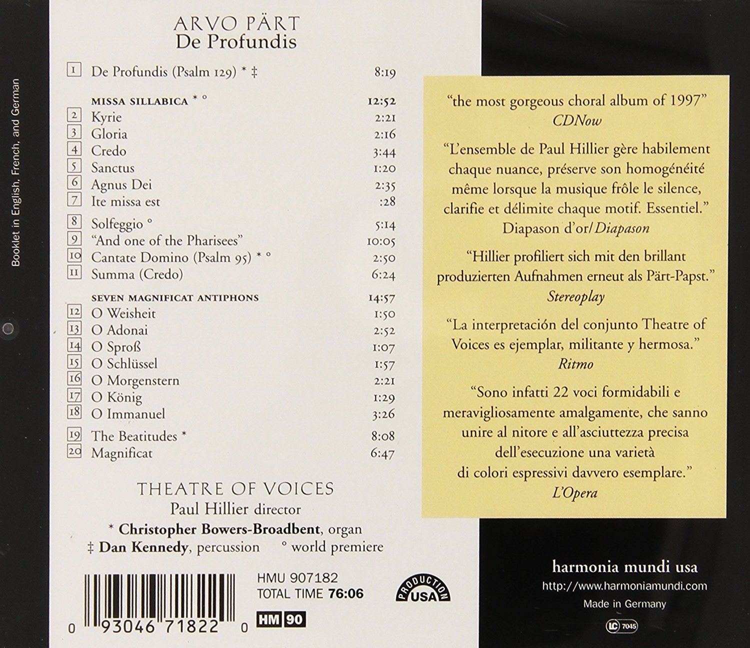 Theatre of Voices, Paul Hillier: Pärt: De Profundis - CD Foto